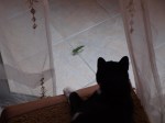 I had a visitor early today Jeff got some good pictures it looks like a Katydid from back home it’s the size of canary and is probably gentler. Jeff picked him up and let him fly away he’s sitting on the wall across the court yard now. Those of you that have already read the previous post will notice it’s dated today but it was posted last night I don’t know where word press originates from but there is a big difference in time. Right now it’s 8:25 Am down here and that would make it about 9:25 on the east coast .Hari is awake you can hear him across the way making all kinds of noise which means he’s happy and most likely on his way to see me. They’re going to turn off the water at 9AM so Jeff has to go and take a shower now (believe me that’s a good idea) so I’ll be leaving if anything else exciting happens I’ll be back later CIAO.